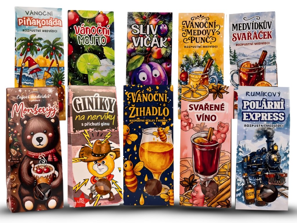 Čajoví medvídci pro dospělé v šesti svátečních příchutích: Slivovičák, Svařené víno, Vánoční mojito, Polární express, Medový punč a Piňakoládu. Bez kapky alkoholu, ale s...