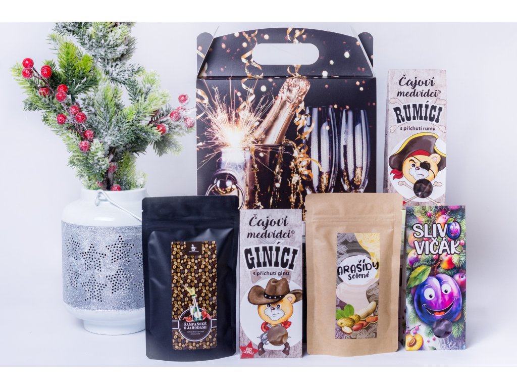 Silvestrovský box plný netradičních dobrot jistě překvapí a potěší každého hostitele! S Rumíky a Giníky si můžete užít zábavu během večera, k tomu uzobávat arašídy a luxusní kávička s příchutí Šampaňského a Jahod šampaňském pak přijde vhod ráno po probdělé noci jako životabudič ;)