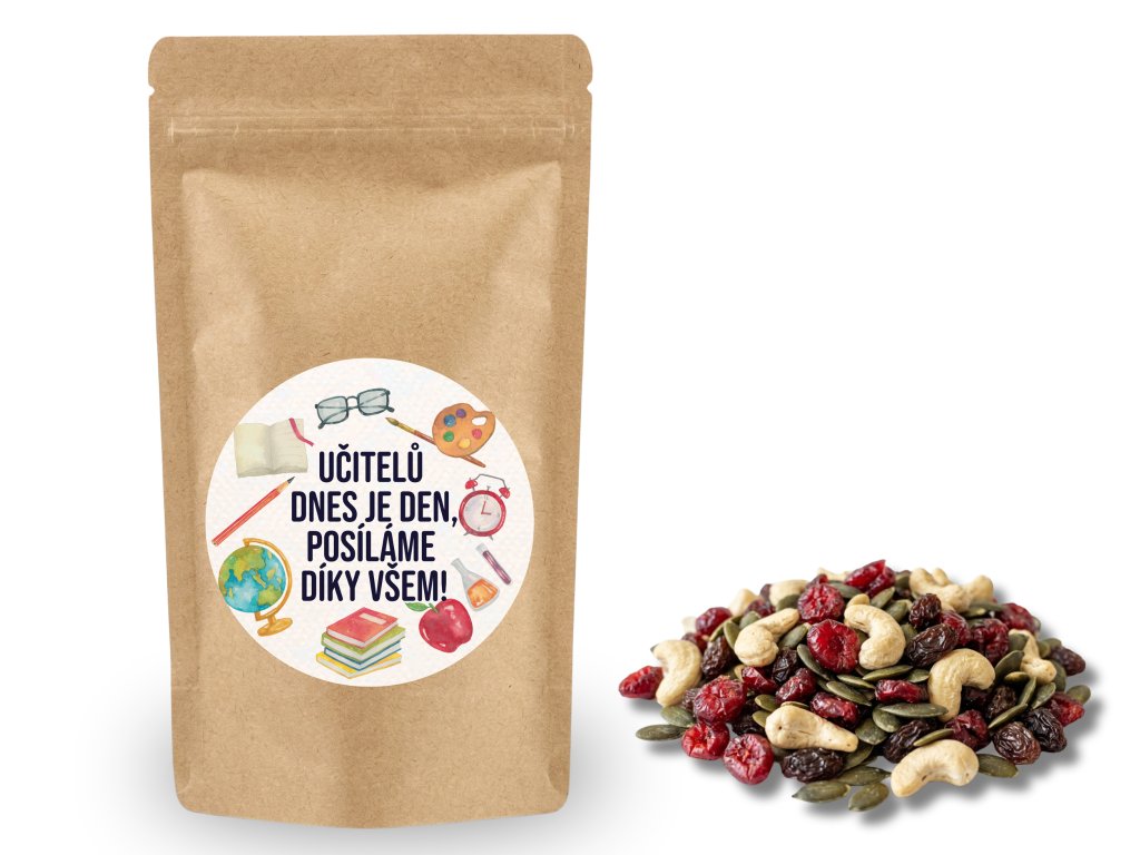 Tento dárkový balíček obsahuje chutnou směs oříšků a sušeného ovoce, která potěší a dodá energii po dlouhém dni ve škole.