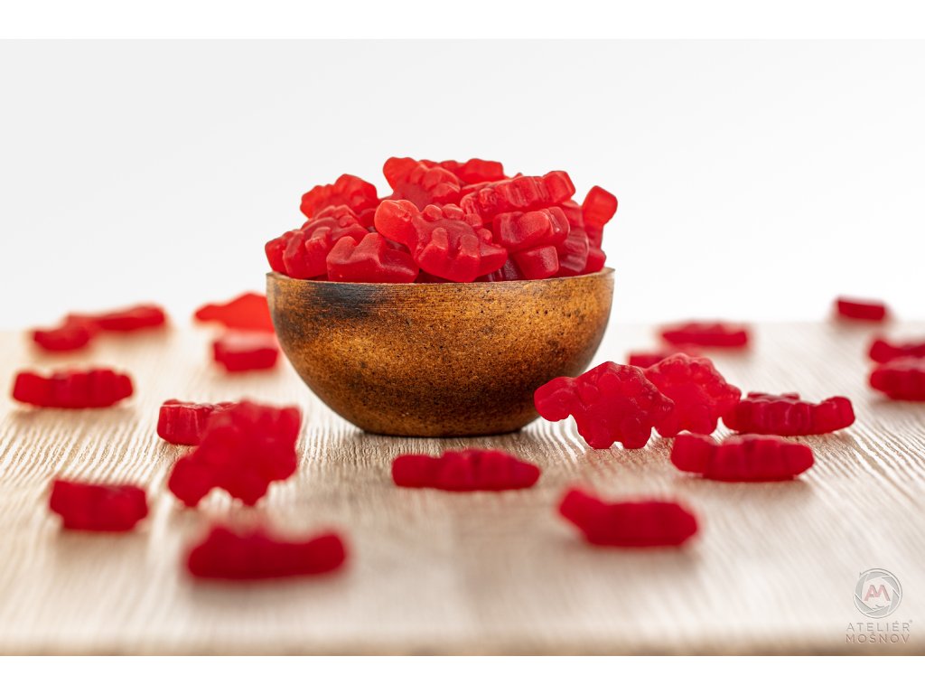 Složení: cukr, glukozový sirup, voda, želatina, koncentrovaná bílá hroznová šťáva, rostlinný výtažek (dýně, ředkev, rajče, jablko, bezinka) příchutě, extrakt z bílého čaje 1%, přírodní ovocné sladidlo, karnaubský vosk, koncentrovaná jablečná šťáva, koncentrovaná meruňková šťáva, koncentrovaná hrušková šťáva.