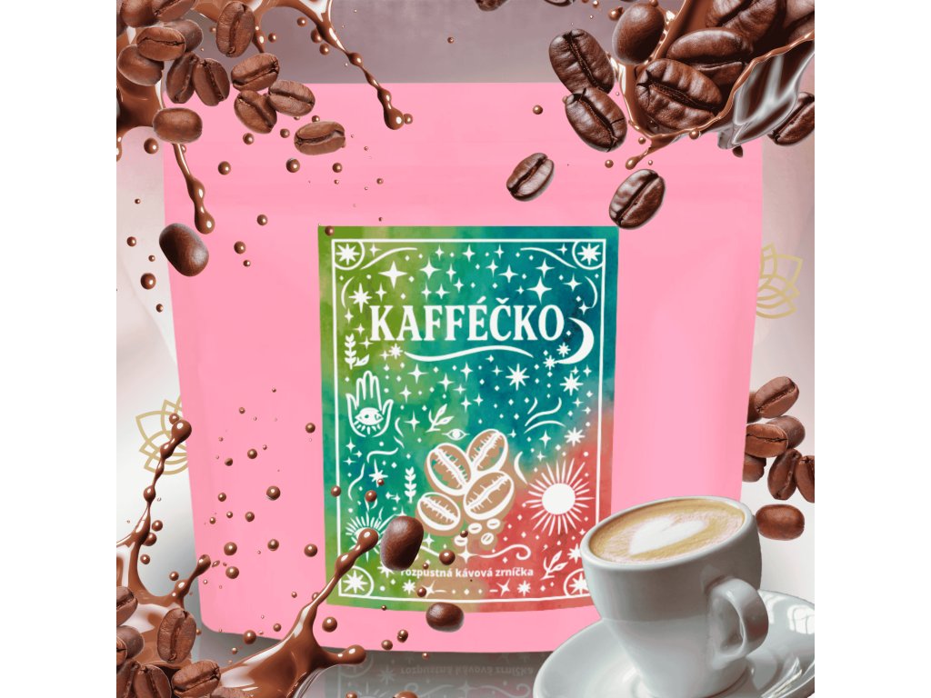 Příprava: 2 až 4 kávová zrníčka zalijte horkou vodou, zamíchejte lžičkou a nápoj Kaféčko je na světě.