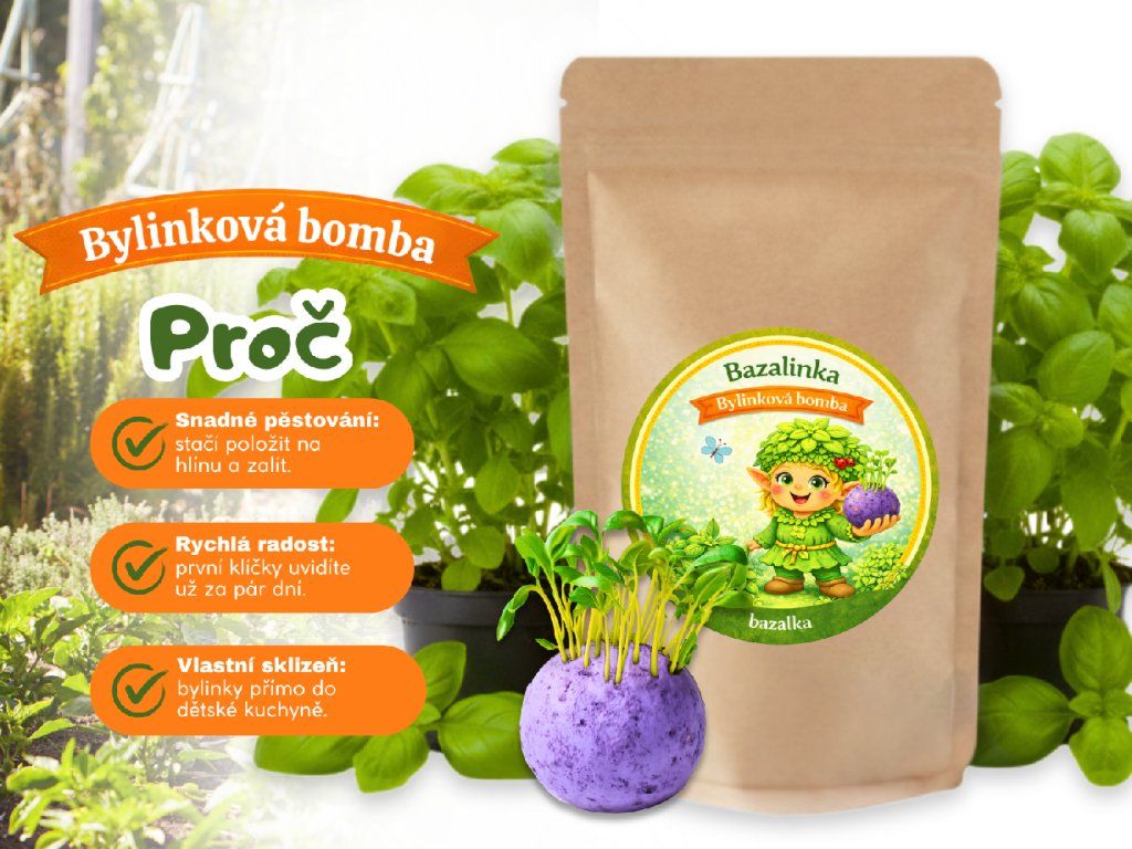 Voňavá kuchyňská zahrádka z jedné kuličky. Bazalinka z kolekce Malý zahradníček umožní dětem vypěstovat vlastní bazalku jednoduše a hravě. Stačí položit bombu na zeminu, lehce zasypat, zalít a sledovat, jak se objevují první zelené lístky.