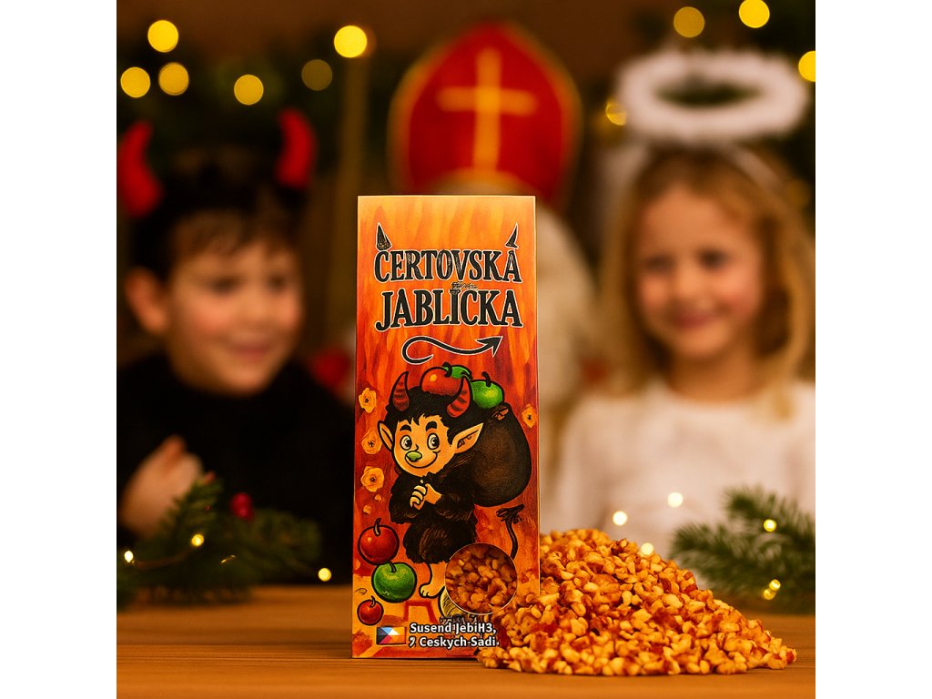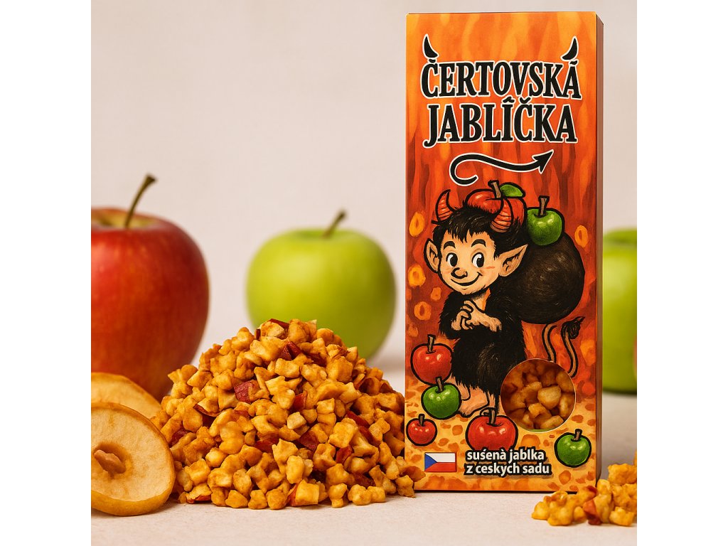 ČERTOVSKÁ JABLÍČKA jsou sušená jablka z letošní úrody českých sadů, nasbíraná s péčí, usušená do měkoučkého křupnutí a zabalená jako pořádná nadílka pro malé i velké mlsouny.