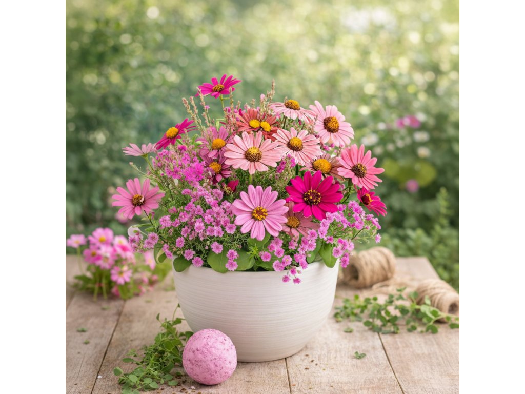 Uvnitř této květinové bomby se skrývá pečlivě vybraná směs čtyř růžově kvetoucích druhů: